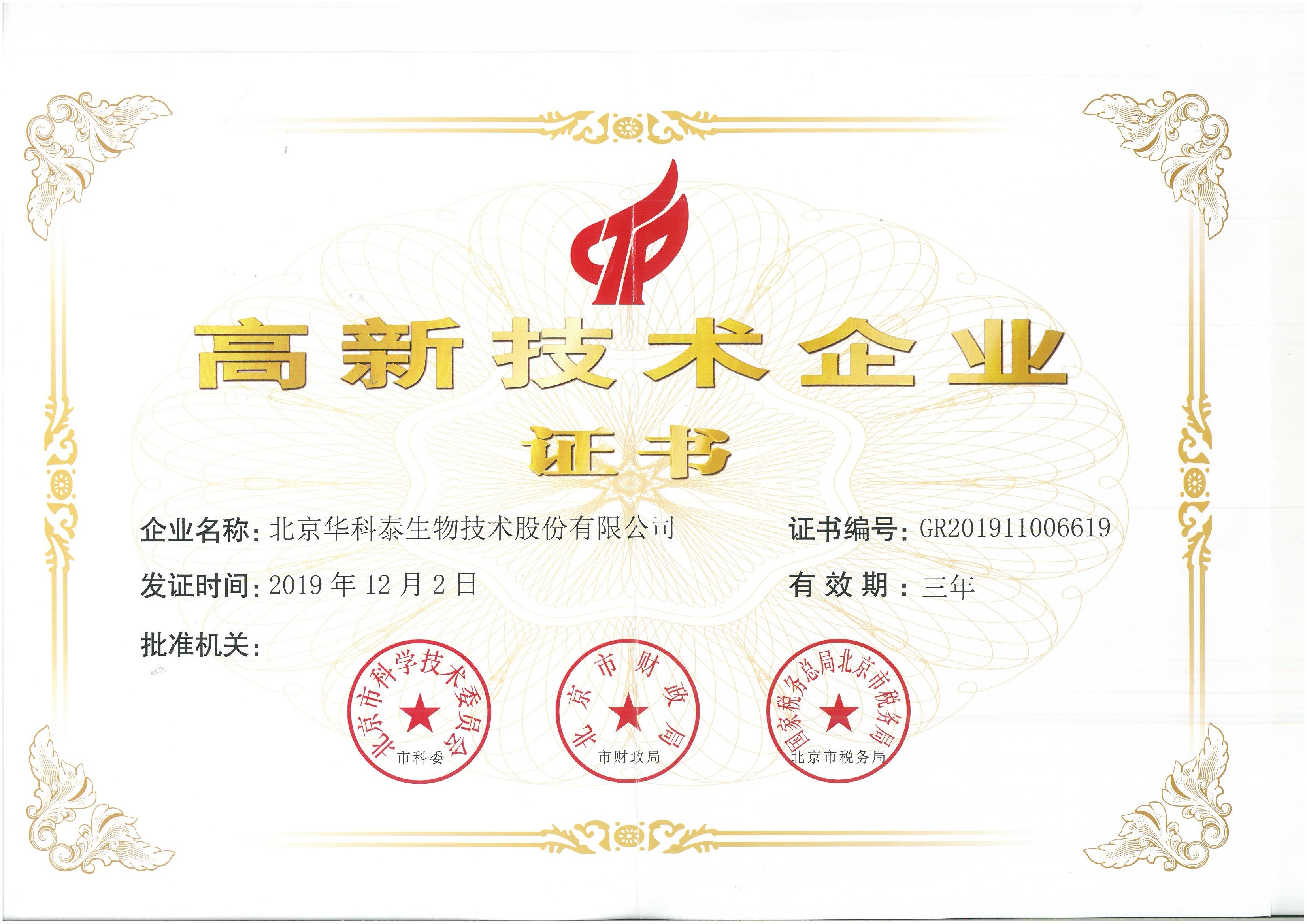 高新技术企业证书